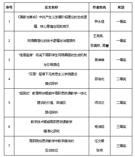 此次获奖论文内容围绕马克思主义学院建设模式探析、思想政治理论课教学方法革新、中高职思政课教学一体化建设,数智技术与思政教育的融合应用等方向展开深入探索。这些研究成果不仅体现了学校在思政教育领域的多元化科研布局,也反映了我校思政课教师在理论研究和课程建设方面的积极投入。