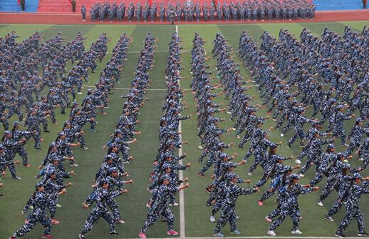 大会在庄严的升国旗仪式中开始。同学们在嘹亮的口号声中,以饱满的精神面貌列队通过主席台接受检阅。在教官的指挥下,队列方阵、军体拳方阵、战术方阵、擒敌拳方阵、擒敌配套、花样方阵先后进行了表演,同学们精彩的表演赢得了领导及在场同学热烈的掌声。