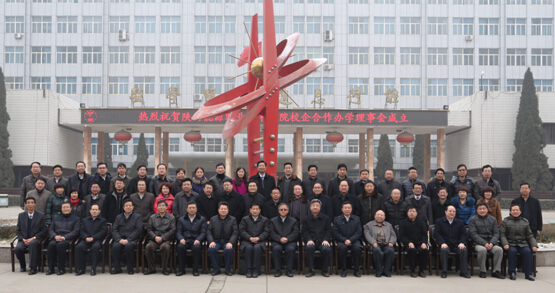 图为白长安同志和高勤社同志为校企合作办学理事会揭牌