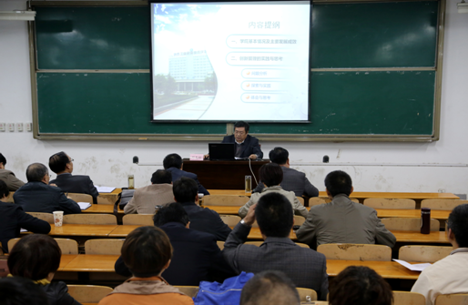 10月31日下午,我院处科级干部管理业务培训班第五场报告会在综合楼402教室进行,特邀陕西工业职业技术学院党委书记邓志辉教授主讲。报告会由院党委副书记、副院长何从军主持,院领导、全院处科级干部参加。