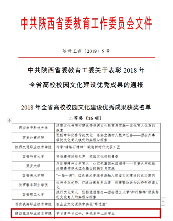 1、《学习青年习近平,争做总书记好学生》——陕西能源职业技术学院开展学习《习近平的七年知青岁月》系列活动获2018年全省高校校园文化建设优秀成果二等奖。