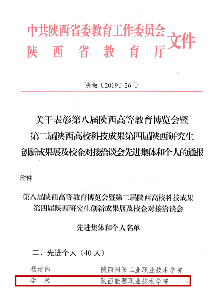 3、组织宣传部李粒同志获第八届陕西高等教育博览会暨第二届陕西高校科技成果第四届陕西研究生创新成果展及校企对接洽谈会先进个人。