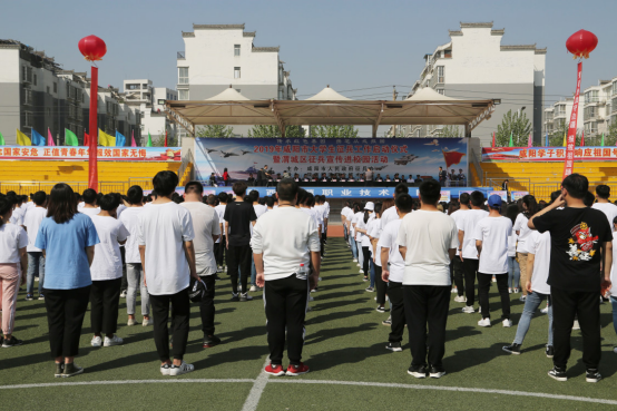 4月18日,“传承红色基因 携笔从戎报国”2019年咸阳市大学生征兵工作启动仪式暨渭城区征兵宣传进校园活动在我校咸阳校区运动场举行。