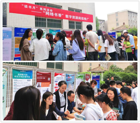 5月16日,图书馆在培训楼前举办“书香伴我成长,阅读圆我梦想”为主题的“网络书香”数字资源阅读推广活动。参加此次活动的数字资源供应商有:中国知网、超星电子图书、百度文库、万方医学网、西安中图、悦听有声数字图书馆、维普智立方、正保视频数据库、方正阿帕比。