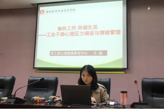 4月20日下午,在实训楼六楼报告厅,校工会组织举办教职工心理健康知识讲座。邀请我校学工部心理健康教育中心主任王晶同志主讲,校工会委员、基层工会主席和委员、咸阳校区部分教职工80余人参加。讲座由校工会主席杨笑琪同志主持。