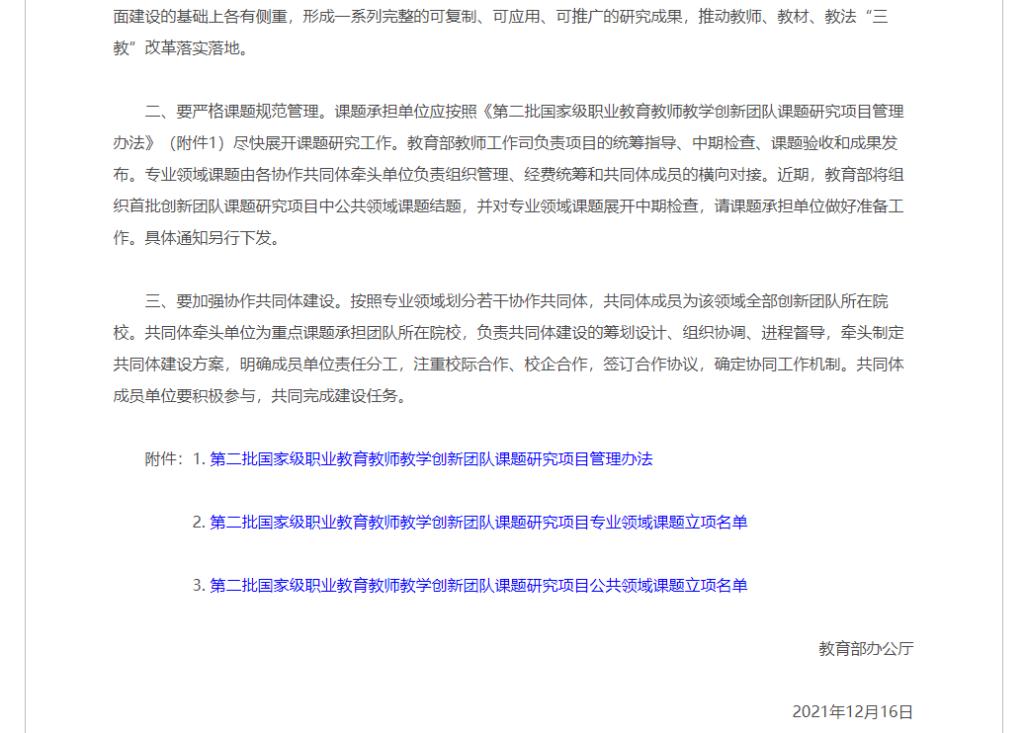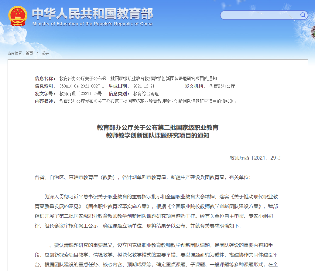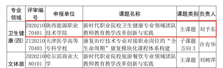 近日,教育部办公厅印发了《教育部办公厅关于公布第二批国家级职业教育教师教学创新团队课题研究项目的通知》(教育部教师厅函〔2021〕29号),遴选了第二批国家级职业教育教师教学创新团队课题项目专业领域主课题(即重点课题)34个、子课题138个、一般课题40个、公共领域课题10个。我校康复治疗技术专业教师教学创新团队申报的主课题“新时代职业院校卫生健康专业领域团队教师教育教学改革创新与实践”获批立项,为陕西省高职院校获批立项的三项主课题之一。