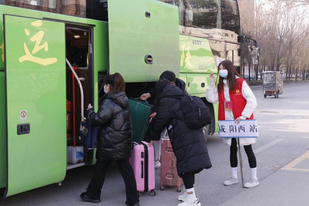 学校联系大巴车连续早上6:30-晚上10:00,全天候护送学生到咸阳火车站、咸阳西站、咸阳北站,截止15日下午6:00,累计发送大巴车200余次护送学生近5000人点对点到咸阳各火车站,除此之外,晚上10:00-早上7:00之间,学校教职工自发组建“爱心车队”,护送学生前往车站。学校门口,随处可见志愿者耐心引导学生前往车队停靠点、帮助学生搬送行李上车。