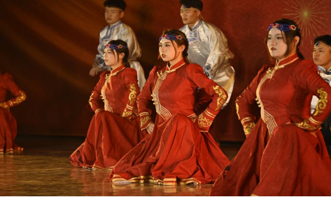 晚会尾声,红绸飘舞,鼓槌飞扬,《腰鼓声声》震撼出场。每一次击打,鼓面都发出激昂的声响,节奏明快,如雷贯耳,传递着蓬勃的生命力与无限活力。《矿工之歌》中舞者们身着厚重的矿工服,步伐刚健有力,闪烁的矿灯与舞者们的身影交织,传递出矿工们无畏艰难、默默奉献的崇高精神。