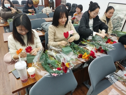 随后的创意插花活动现场花香四溢、暖意融融。学院提前准备了玫瑰、康乃馨、洋桔梗、尤加利叶等各色鲜花与花艺工具,邀请了专业插花老师现场教学。老师从花材选择、色彩搭配到造型设计,花艺老师进行了细致讲解和示范。在花艺老师的指导下,女职工们发挥创意,亲手制作出一个个独具匠心的插花作品,在感受美、欣赏美、创造美的过程中,度过了一个温馨而有意义的节日。活动最后,学院还为每位女职工准备了两提纸巾作为节日慰问品,传递了组织对女职工们的关怀与祝福。