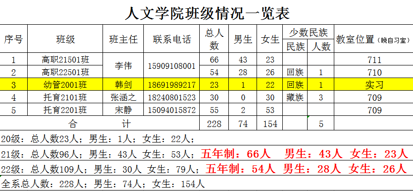 人文与教育学院目前学生总人数228人。其中三年制108人,五年制120人。另百万扩招10人进行网络学习。