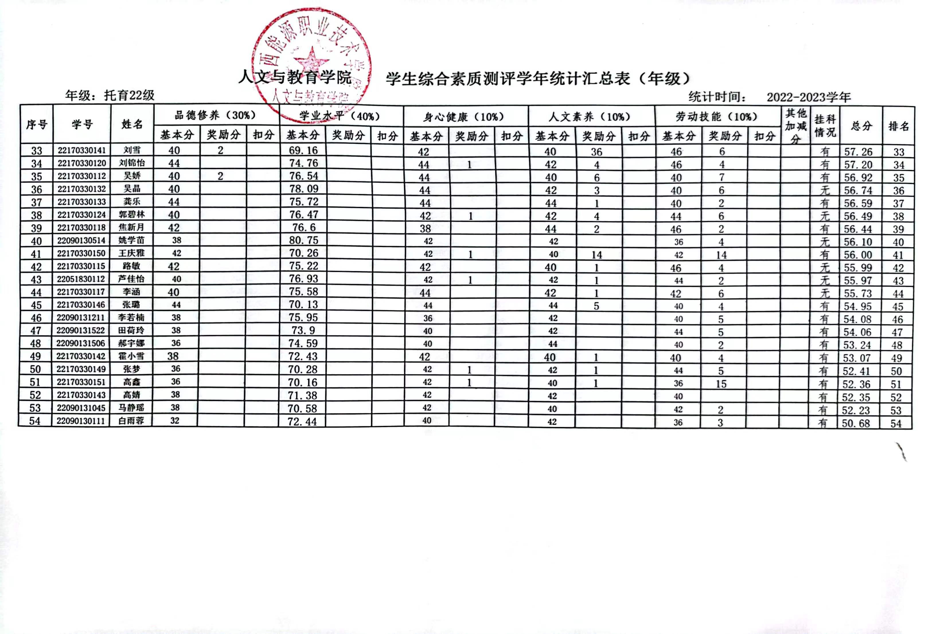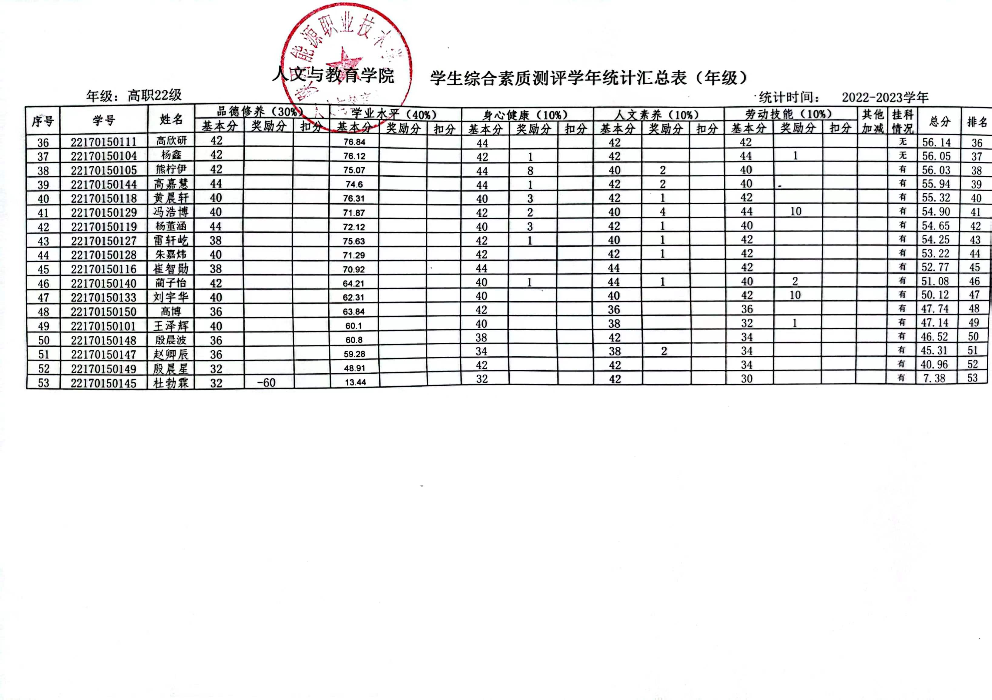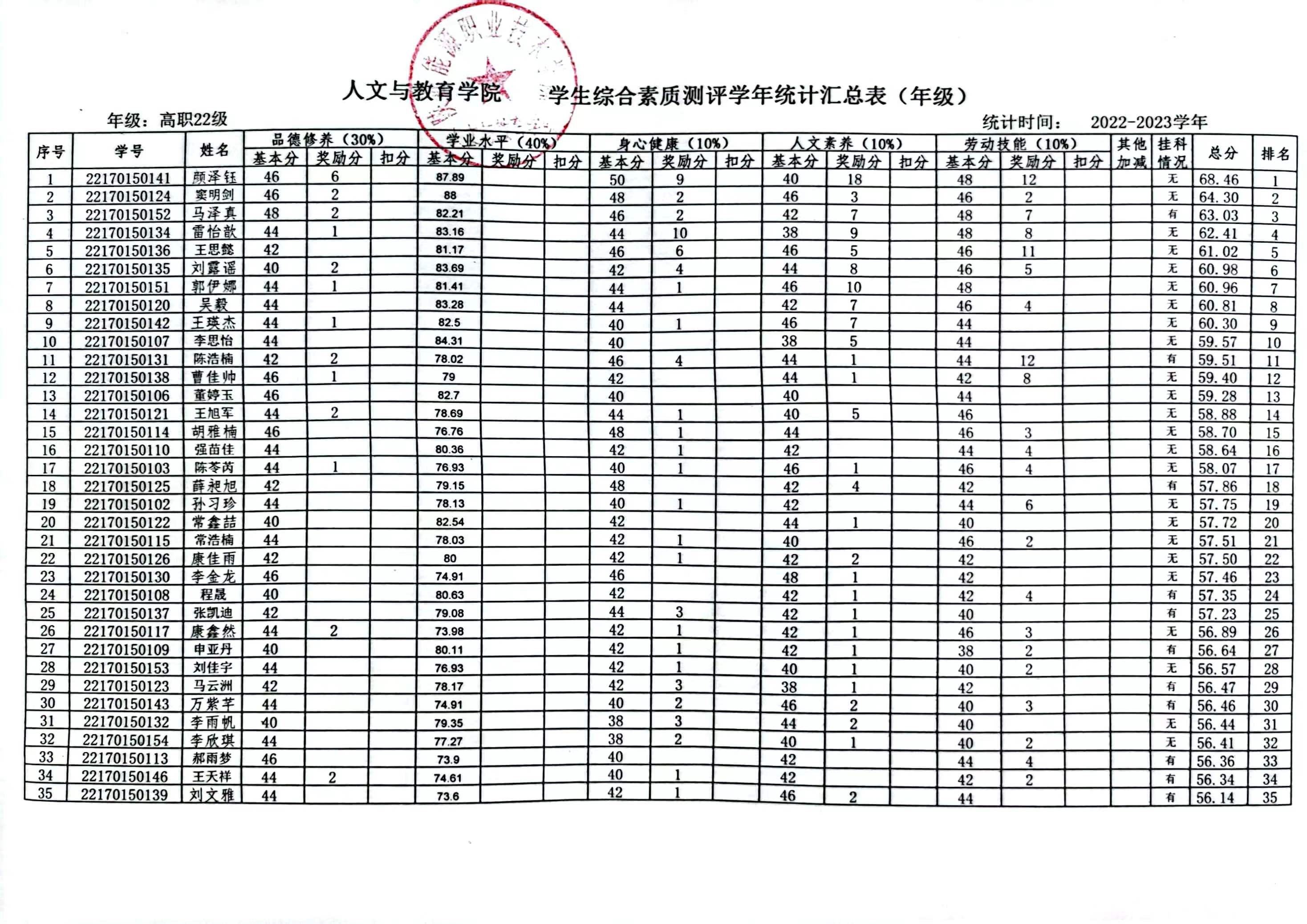 按照《陕西能源职业技术学院学生综合素质测评实施办法(修订)》(陕能院学〔2021〕36号)及学工部《关于做好2022-2023 学年学生综合素质测评总评及年度评优工作的通知》要求,人文与教育学院严格执行文件,认真总结、整理、核算学生综合素质各模块总成绩,经过材料提交、班级鉴定公示及学院审核,现将人文与教育学院学院2022-2023学年学生综合素质测评结果公示如下。