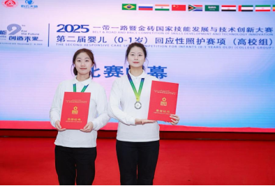 12月5日至8日,2025一带一路暨金砖国家技能发展与技术创新大赛第二届婴儿(0-1岁)回应性照护赛项(高校组)全国总决赛在重庆工贸职业技术学院举办,来自全国92所高校的167位选手同台竞技。经过激烈角逐,我院托育2501班学生惠琳涵获一等奖、刘欣怡获二等奖,韩剑、杨婉洁两位教师获优秀指导教师奖。