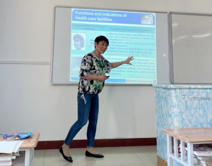 王锐和党娟芳两位老师选择了题为Heathcare safety for nursing personnel这一节内容。王锐老师的讲解使学生懂得了医护人员在工作中如何做好自我防护,同时鼓励学生努力学习保家卫国。