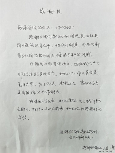 10月29日上午,我院收到了一封来自咸阳市秦都区新苗幼儿园的手写感谢信,揭开了校企合作的丰硕成果,标志着我院托育专业以“产教融合”推动人才培养、服务行业发展的实践路径取得显著成效。