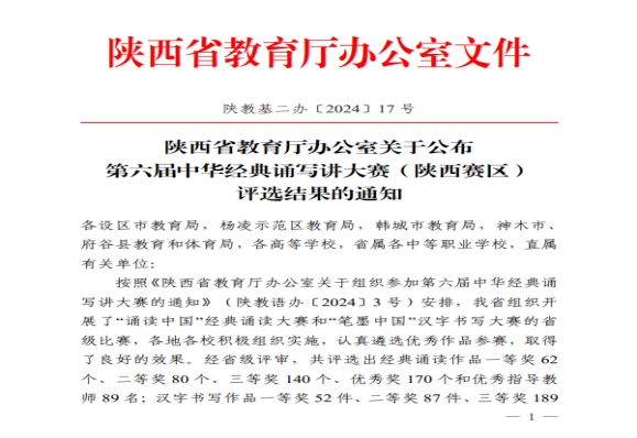 9月11日,陕西省教育厅办公室公布了第六届中华经典诵写讲大赛(陕西赛区)评选结果,由我校教师梁丹、宋磊、王少华、岳佩、陈福稳、仇京龙、冯毅、段春宇、董银英、王涛、许博闻、王利荣组成的教师组参赛团队在经典诵读大赛中荣获二等奖,是目前我校参加此项比赛获得的最好成绩。