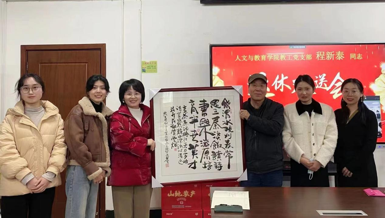 欢送会上,党总支副书记王利荣为程新泰同志送上了纪念品,同时携语文组全体教师和程老师合影留念;组织委员刘博洋致欢送词,并代表学院党总支对程老师多年来的辛勤付出表示感谢,也祝福退休同志健康快乐。