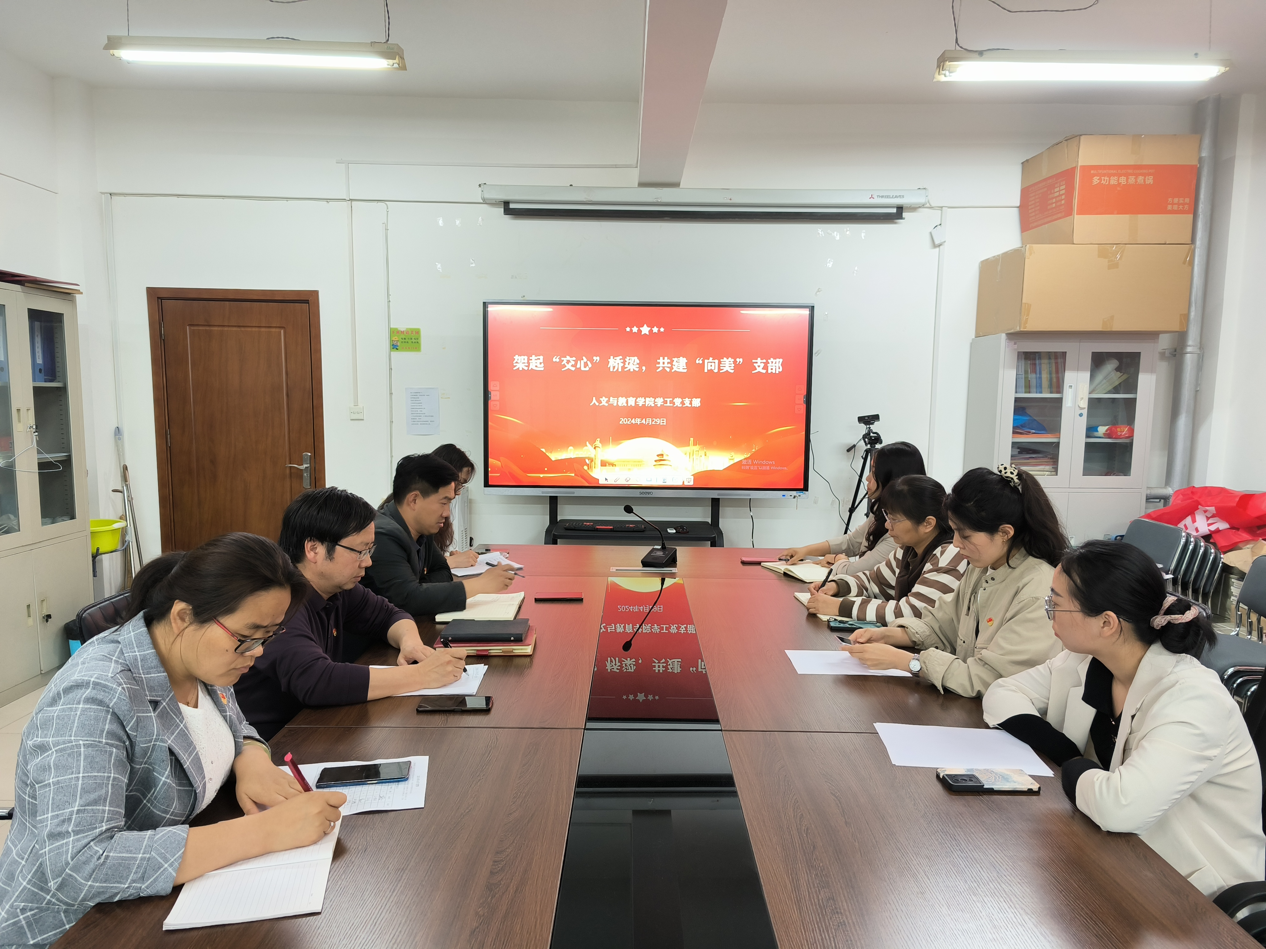 为了深入贯彻落实习近平新时代中国特色社会主义思想,加强党员的理想信念教育,丰富党纪学习教育内容,共建向美支部。2024年4月29日,人文与教育学院学工党支部于508会议室召开“架起‘交心’桥梁共建‘向美’支部”主题党日学习活动。学工支部全体党员参加本次活动,会议由学工党支部书记刘博洋主持。