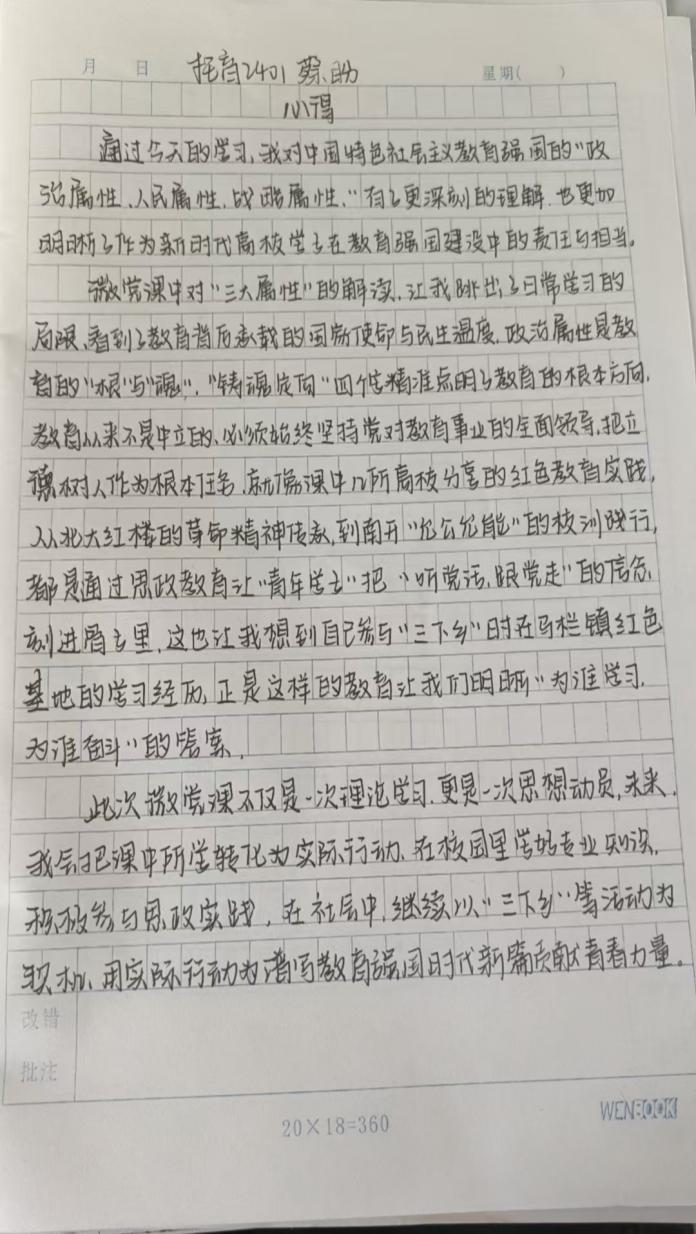 观看过程中,同学们全神贯注,认真记录。活动结束后,大家纷纷表示,本次学习不仅深化了对教育强国战略的理解,更激发了投身教育事业的热情与责任感。预备党员魏思柔同学表示:“微党课虽已结束,但带给我的思考和动力却不会停止。未来,我会时刻牢记党员的责任与使命,在新时代的教育征程中书写属于自己的奋斗篇章 。”