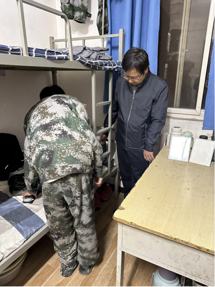 党总支书记买中傲首先关心了新生们军训期间的训练和生活情况,军训虽然很累,但是努力的样子很美。慰问过程中对宿舍内务进行了检查,买中傲书记对学生表示:内务整理不仅关系到学生们的居住环境,更体现了他们的纪律观念和自我管理能力。他鼓励学生们要珍惜军训期间的宝贵时光,严格按照教官的要求整理内务,努力提升自己的综合素质。
