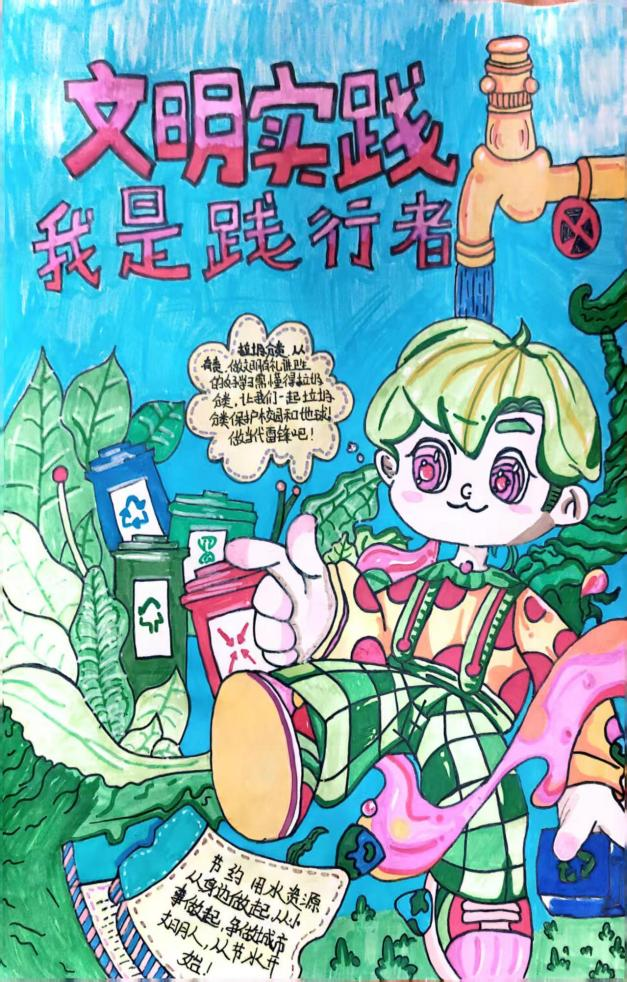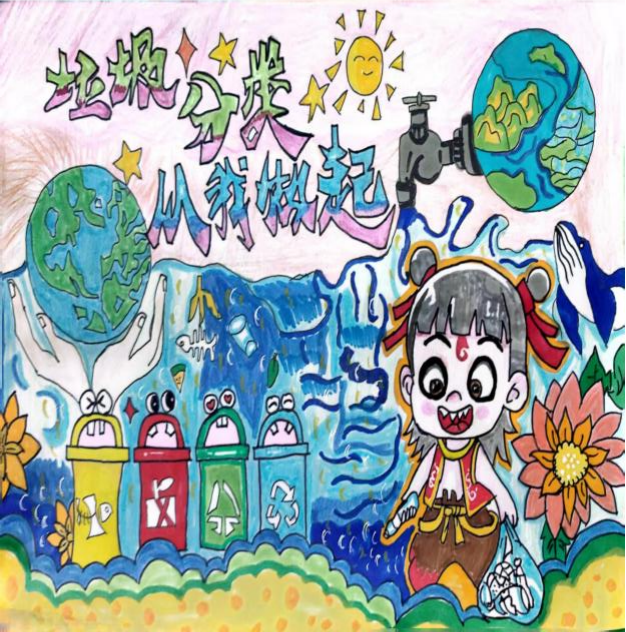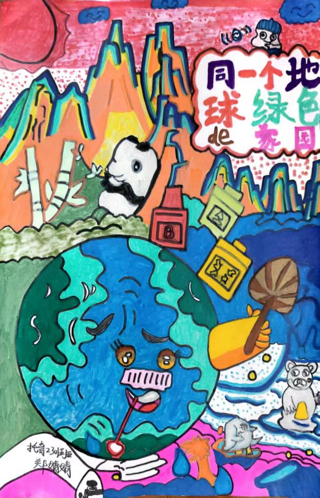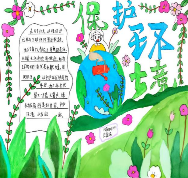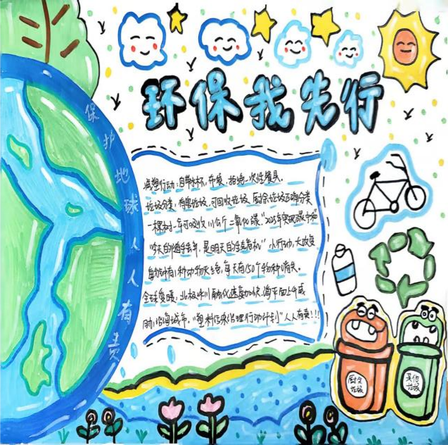 在环保主题手抄报创作中,同学们围绕 "绿色愿景"" 生态警示 ""低碳行动" 三大主题展开创作。作品《同一个地球,绿色的家园》以高山为背景,通过森林、海洋、城市的和谐共生画面,展现 "人与自然生命共同体" 理念;作品《垃圾分类从我做起》,呼吁垃圾分类从你我开始,美化家园需你我参与。