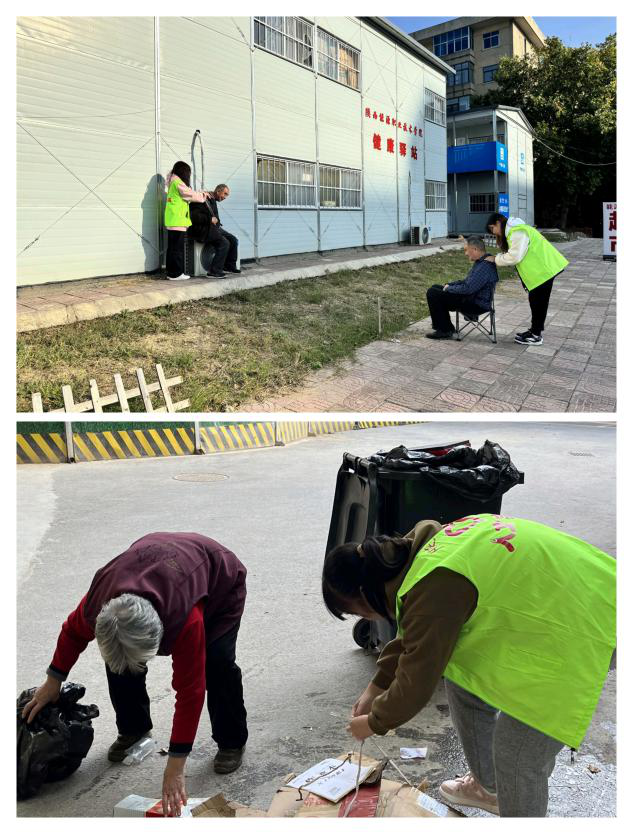 活动中所有志愿者来到指定地点,志愿者们来到老年活动中心,为老人们放松肩膀,并和他们聊天。在活动过程中碰到一个老奶奶在垃圾桶旁边收拾纸箱子和瓶子,志愿者们上前帮助她整理纸箱子。在家属楼内帮行动不方便的老奶奶清理草丛卫生,并帮整理物品。