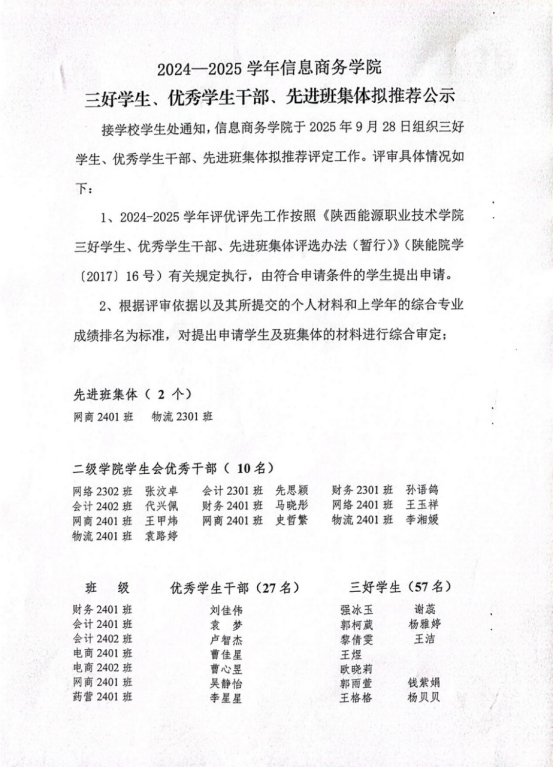 2024-2025学年信息商务学院三好学生、优秀学生干部、先进班集体拟推荐公示