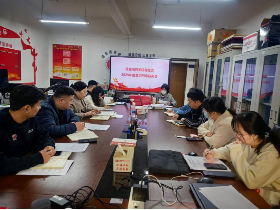 为持续压紧压实意识形态工作责任制,巩固提升意识形态领域安全防线,总结年度工作成效并谋划未来方向,2025年12月3日,信息商务学院党总支在学院会议室组织召开了2025年下半年意识形态工作研判会。学院党总支书记、支委成员、各党支部书记及支委、教研室主任、辅导员代表等参加会议。会议由党总支副书记陈强主持。