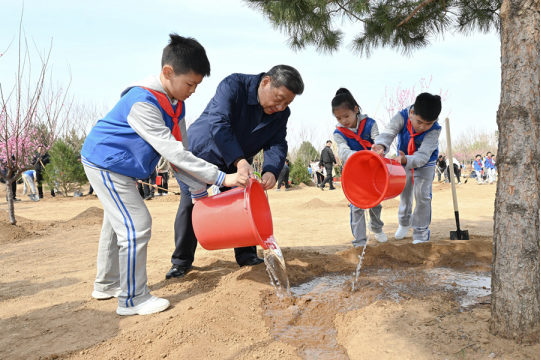 4月3日,党和国家领导人习近平、李强、赵乐际、王沪宁、蔡奇、丁薛祥、李希、韩正等来到北京市丰台区永定河畔参加首都义务植树活动。这是习近平同少先队员一起给刚栽下的树苗浇水。新华社记者 谢环驰 摄