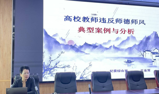 培训会上,校纪委副书记王金茸围绕“高校教师违反师德师风典型案例与分析”主题,从领袖寄语、道德规范、法规制度、典型案例