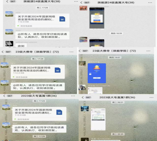 根据学校的通知安排,我部门开展了以“网络安全为人民,网络安全靠人民”的主题活动。通过微信群、教学平台等方式通知到2023级、2024级共计2800余名学生参加到学习当中,以下是部分学习截图: