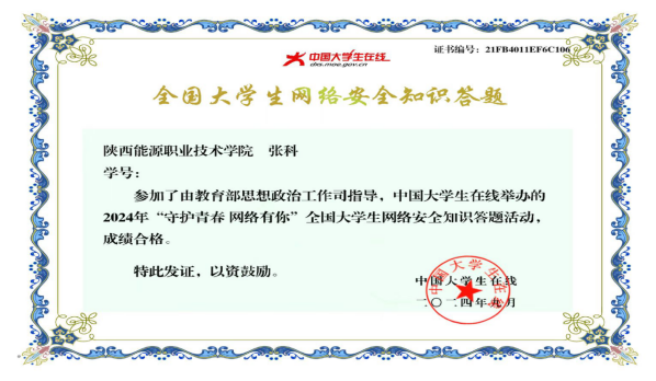 学生积极参与了全国大学生网络安全知识答题,通过线上答题方式普及了网络安全知识,提高了大学生防范网络诈骗、安全使用网络的能力。通过学习,给学生们普及国家网络安全制度及法律法规,让学生们提高了网络安全意识和技能。营造了全员关注网络安全的良好氛围。培养大学生成为爱科学、知安全、懂安全、会安全,成为捍卫网络安全的主人翁。