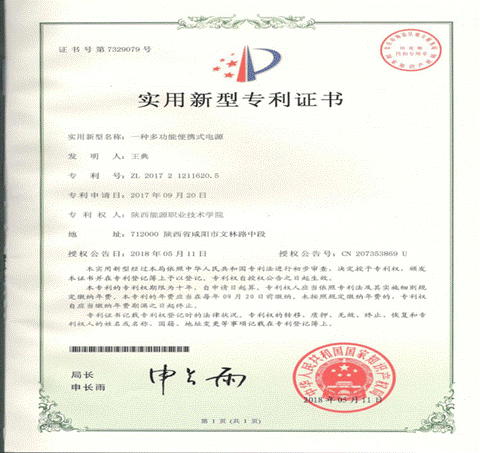 在学习和准备技能大赛的同时王典同学也一直没有放下自己的发明创造,在学校人、财、物的充分保障下,在科研信息处的协助下,王典《一种多功能便携式电源》获国家知识产权局新型专利授权。目前王典同学还有4项专利正在进行申报材料的优化。