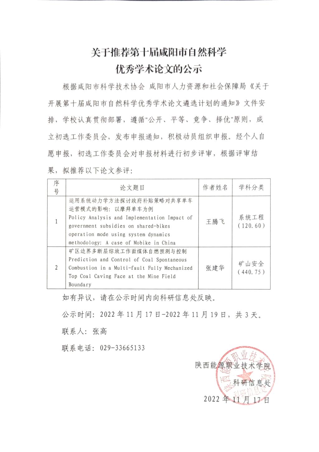 关于推荐第十届咸阳市自然科学优秀学术论文的公示