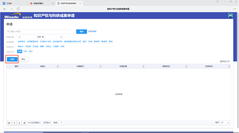 5、进入页面后点击”发起”按钮,然后在弹出界面填写专利相关信息。