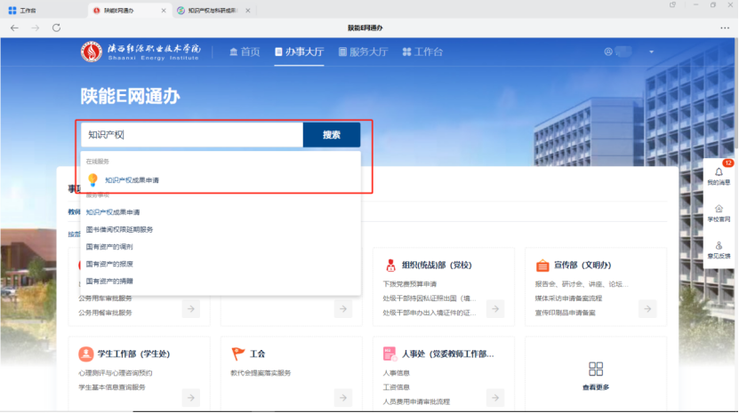 4、进入E网通办(网页端与企业微信端均可),进入知识产权成果申请界面(办事大厅->搜索->知识产权)