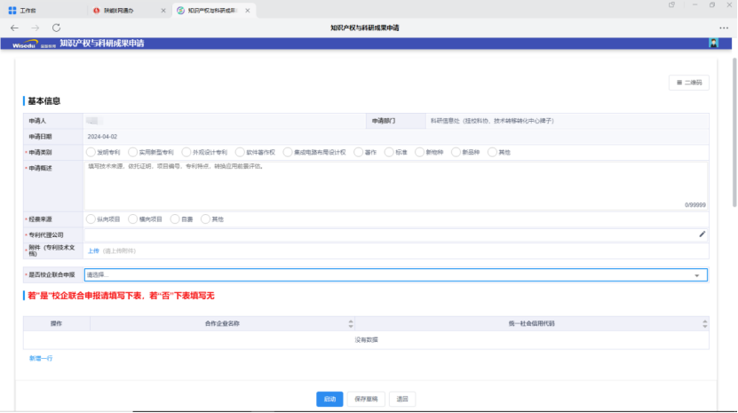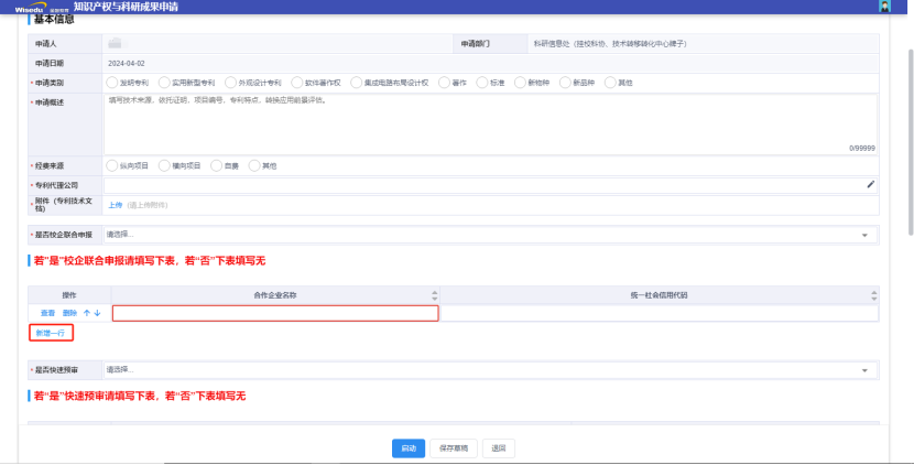如果是校企联合申报的知识产权,在是否校企联合申报栏目中选择是选项,否则选择否。并点击新增一行栏目,填写企业名称、企业社会信用代码信息。