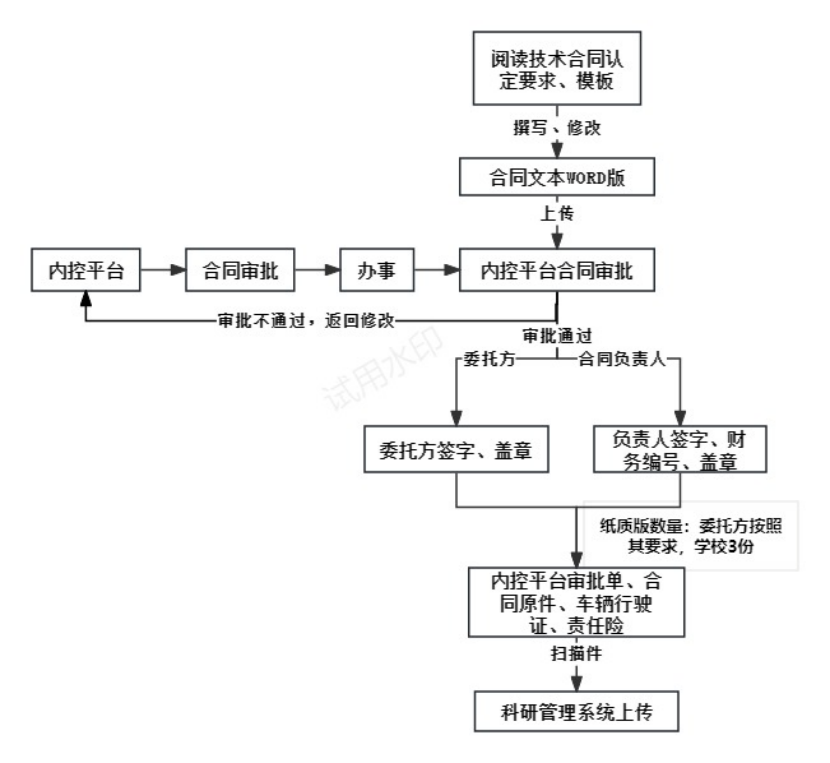 4、等待内控平台进行审批,审批如不通过,请按照审批意见进行修改、补充。如审批通过,则需要负责人、委托方在合同材料上签字、盖章(财务处合同专用章)。