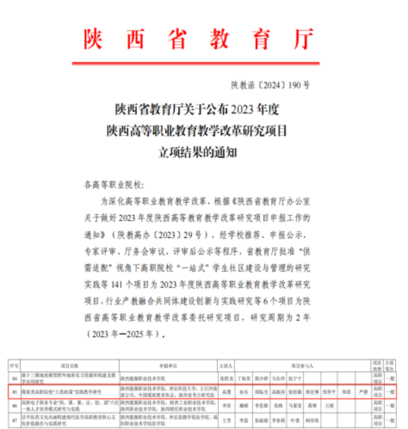 根据《陕西省教育厅办公室关于做好2023年度陕西高等教育教学改革研究项目申报工作的通知》知悉,马克思主义学院副院长高慧主持的《煤炭类高职院校“大思政课”实践教学研究》获批陕西高等职业教育教学改革研究一般项目。