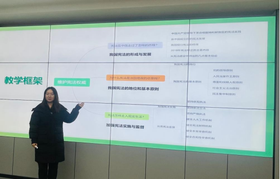张晗颖围绕《思想道德与法治》课程第六章第三讲“维护宪法权威”讲解了备课思路。首先,她讲述了本节课的教学目标、教学重难点、教学方法等内容。其次,她重点讲述了本节课的教学设计,从视频《宪法与我们的一生》切入,帮助学生初步认识国家宪法,围绕三个问题:宪法在中国走过了怎样的历程?为什么宪法是治国理政的总章程?宪法怎样走入现实生活?通过案例分析、合作探究、设计情境等教学方法引导学生从问题出发,深入理解宪法是我国的根本法,掌握宪法的地位和基本原则,明确维护宪法尊严的意义,从而增强中国特色社会主义法治道路自信。