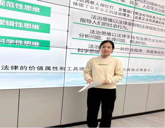 李晓琪围绕《思想道德与法治》第六章第四讲“自觉尊法 学法 守法 用法”展开。通过创设情境提出“如果外卖实物与商家宣传照片不符,你会选择忍气吞声还是用法律手段维权?”引发学生对现实问题的剖析,引导学生思考法治思维的重要性。随后,通过“邯郸男童骑行被碾压案”、电视剧“我们与恶的距离”、“圆圈正义”等案例引导学生理解法治思维的内涵与内容。以“房屋改造被楼下起诉案”、“年轻人火车卧铺下铺挂帘子”、“男子景区遗弃亲生父亲”等真实案例让学生深刻理解公民必须依法行使法律权利和履行法律义务。最后,通过小组讨论、案例分析、视频展示等多种教学方式引导学生自觉尊法、学法、守法、用法,不断提升法治素养。