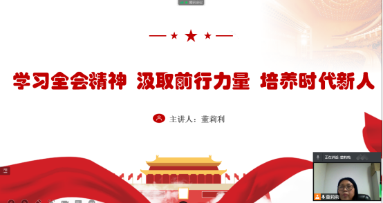 为了深入学习贯彻十九届六中全会精神,进一步提高全体党员教师的综合素质,增强党员的宗旨意识,马克思主义学院党支部书记董莉利于3月16日下午通过腾讯会议线上授课的方式,给本支部党员讲了一堂题为《学习全会精神·汲取前行力量·培养时代新人》的党课,党支部全体党员教师参与学习。