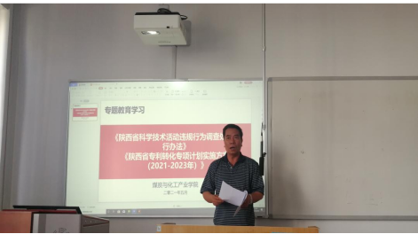 会上,李志带领学院全体教师学习《陕西省科学技术活动违规行为调查处理暂行办法的通知》(陕科发〔2021〕3号)、《陕西省专利转化专项计划实施方案(2021-2023年)的通知》。重点解读了规定中关于科学技术人员的违规行为,以及对违规行为处理措施,强调在科研工作中教师要杜绝学术作假、夸大研究价值、“托关系”等违规行为,诚信做科研。以学院凌洁副教授两项专利成果成功转化的案例,鼓励教师科研以成果转化为导向,加强专利申请前评估,切实提升专利质量,促进成果转化。