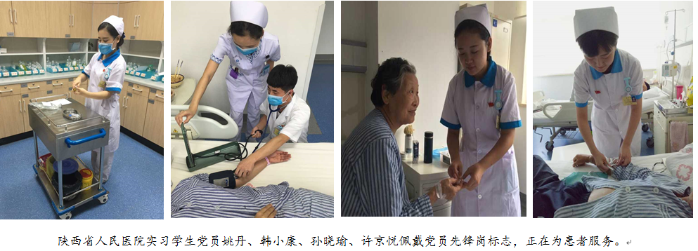 其中,在陕西省人民医院和江苏省张家港第六人民医院实习的党小组表现优秀,他们佩戴党员先锋岗标志,牢固树立“一名党员,一面旗帜”的坚定信念,在工作岗位中亮出党员身份,积极主动,热情服务,以所学知识服务患者,充分发挥了共产党员的先锋模范作用和带动示范作用,深受同事及患者的一致好评。