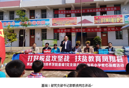21日上午,基础1部所有党员驱车3个小时,来到了陕西省凤翔县董家河乡牛钵峪村小学。在活动现场,牛钵峪村的村支书、学校的教导主任及基础1部党支部书记郭群虎同志分别作了讲话,学校全部23名学生唱“少先队队歌”表示欢迎和感谢。随后,基础1党支部所有党员给每一位学生发放了书包、文具等学习用品,为学校所有8名坚守在乡村一线的教育工作者发放了水杯,为学校捐赠了篮球、乒乓球、羽毛球、跳绳等体育用品。同时,学生代表发言表示感谢并承诺要努力学习成为国家栋梁。