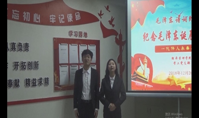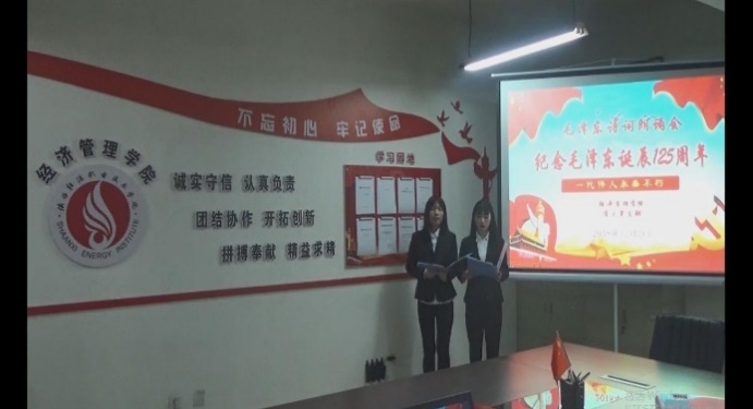 2018年12月26日我中国共产党、中国人民解放军、中华人民共和国的主要缔造者、中国各族人民的伟大领袖毛泽东诞辰125周年纪念日。经济管理学院学工党支部在综合楼410会议室举行毛泽东诗歌朗诵会,并以视频方式向全院师生展播,以此怀念这位时代伟人,他的名字、他的风采、他的精神将继续激励着我们青年人不断前进。
