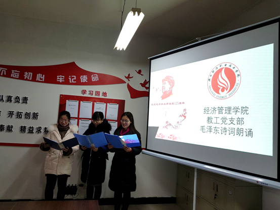 2018年12月26日是毛泽东诞辰125周年纪念日。为纪念毛泽东的丰功伟绩,弘扬爱国主义精神,传承红色经典,激发工作热情,深入推进社会主义核心价值观建设,12月26日下午,经济管理学院教工党支部在办公楼410举行了毛泽东诗词朗诵会。教工党支部全体党员参加了此次活动。