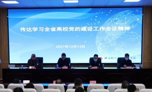 2021年12月13日下午,我校在办公楼四楼文林大讲堂召开专题会议,学习传达12月7日在西安召开的全省高校党的建设工作会议精神。全体校领导、处级干部参加会议。会议由党委副书记任向明主持。