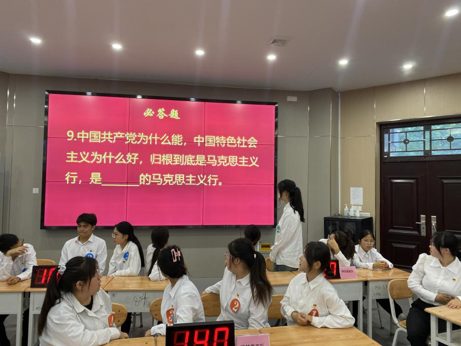 经过前期积极筹备,共有5支队伍通过初赛复赛选拔,成功晋级本次决赛,5支队伍分别从学生预备党员、入党积极分子及团学干部中产生,他们是乘风破浪队、逐梦青春队、冲锋队、踔厉奋发队及与时俱进队。本次比赛内容丰富,涉及党的二十大报告、《中国共产党章程》、党史、习近平新时代中国特色社会主义思想等多方面。决赛题型分为必答题、抢答题、风险题。现场比赛气氛紧张而激烈,各参赛队面对不同类型的题目从容镇定、对答如流,展现了扎实的知识储备。