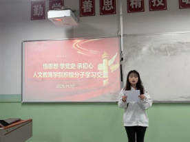 为深化入党积极分子的理论学习,传承红色基因,坚定理想信念,2025年11月12日,人文教育学院党总支学工党支部举办“悟思想·学党史·承初心”入党积极分子交流学习活动。此次活动由学工党支部组织委员贺美然主持,全体入党积极分子参与。