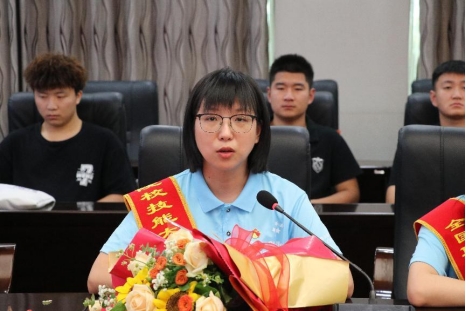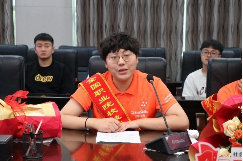 参赛学生电商2001班缑鑫龙代表参赛团队发言。他表示本次获得国家一等奖他非常激动和兴奋,三年的大学生活,怀揣梦想,日复一日的训练终于有了成果。感谢母校和各位老师的培养,本次成绩的取得不仅是对自己努力的肯定,更是对未来的鞭策,是今后自己前行的动力。